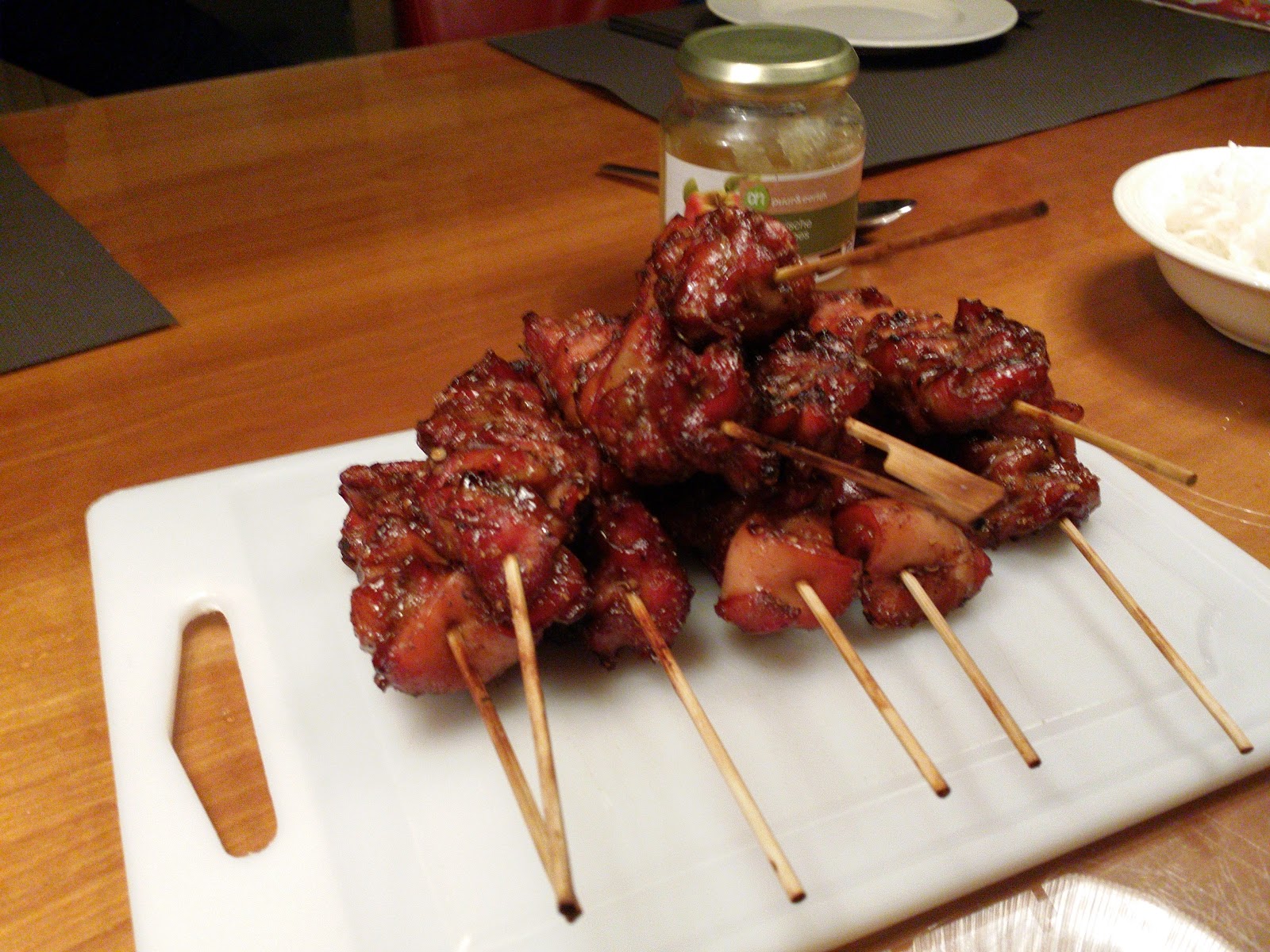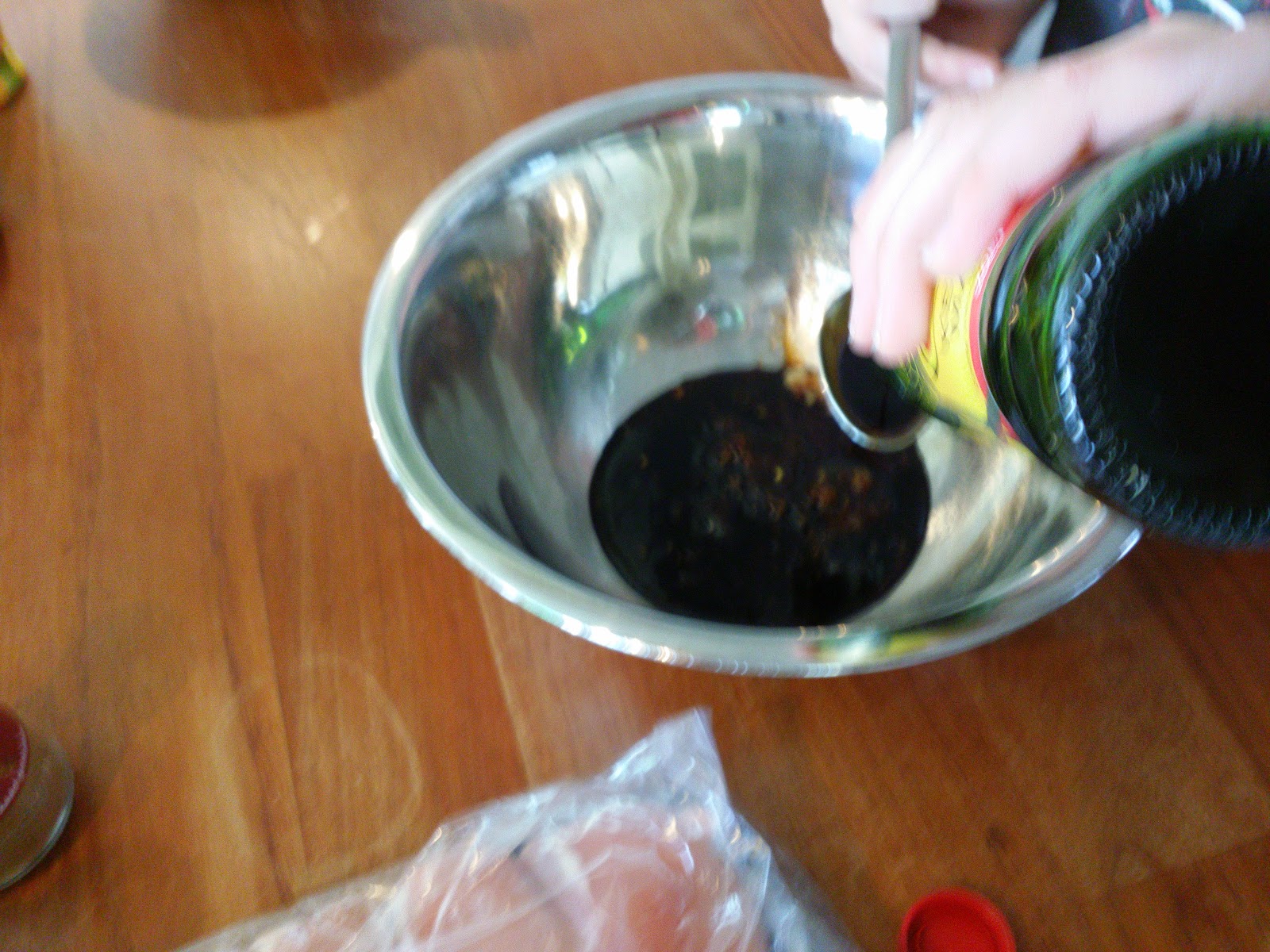 We started out with a nice bowl and a few big scoops of minced garlic. You can never have too much garlic in sateh! Also a main ingredient is Soy sauce…. 10 spoons of soy sauce would do the trick nicely. 4 teaspoons of Coriander and 2 teaspoons of Cumin powder. 3 big spoons of brown sugar, although palm sugar was preferred. I just didn’t have it and brown sugar is a good alternative. A big spoon of black pepper, although that could have been a little less, for the kids. It was pretty spicy and sharp, but the sugar made good for a lot of taste! Now just a nice spoon of oil and a squeeze of lemon juice.
