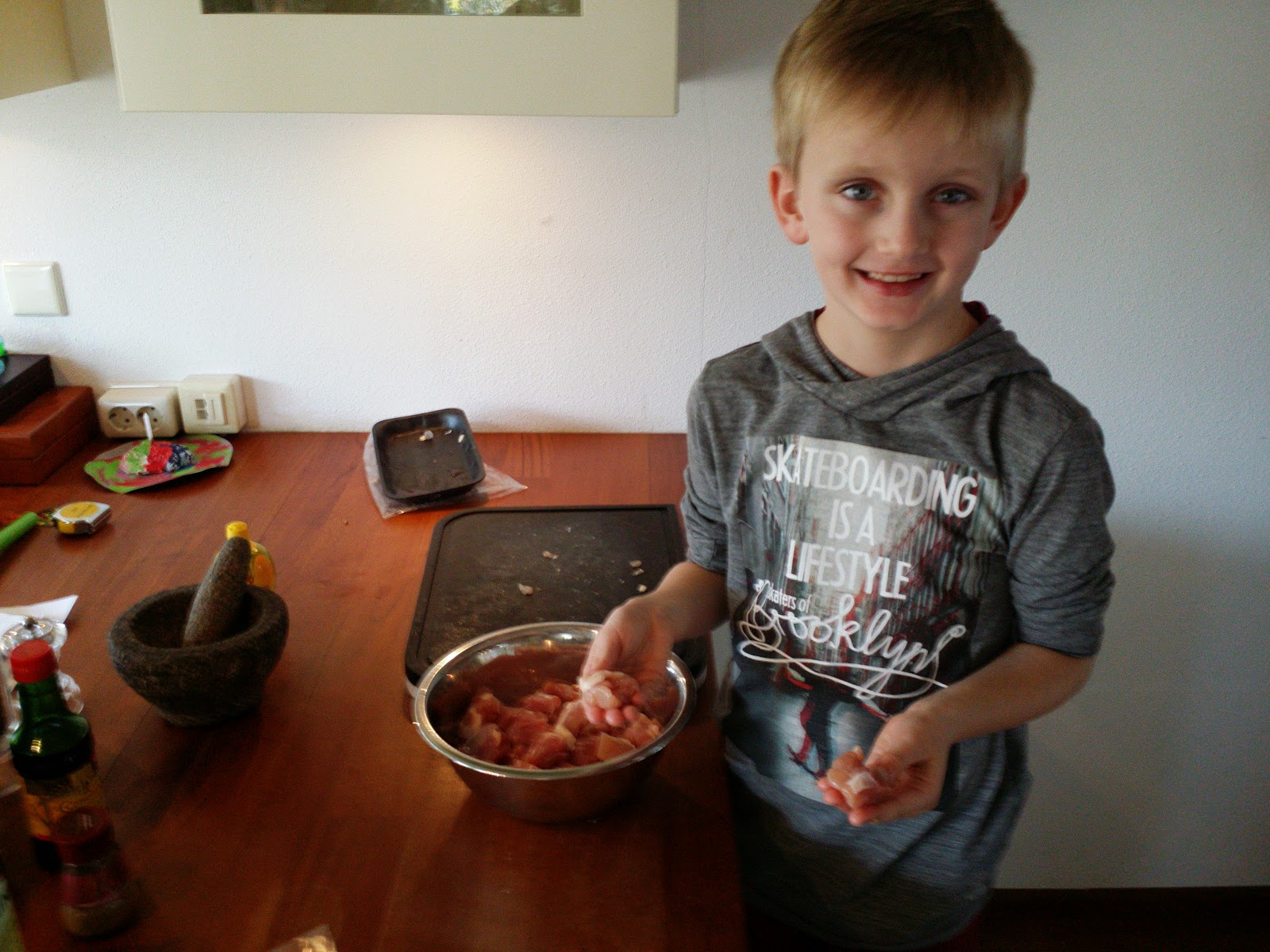 Stir this all well and cut up the meat in small pieces / cubes. The one thing my son didn’t want to do is stir the meat through the sateh mixture with his bare hands, so I did that for him.