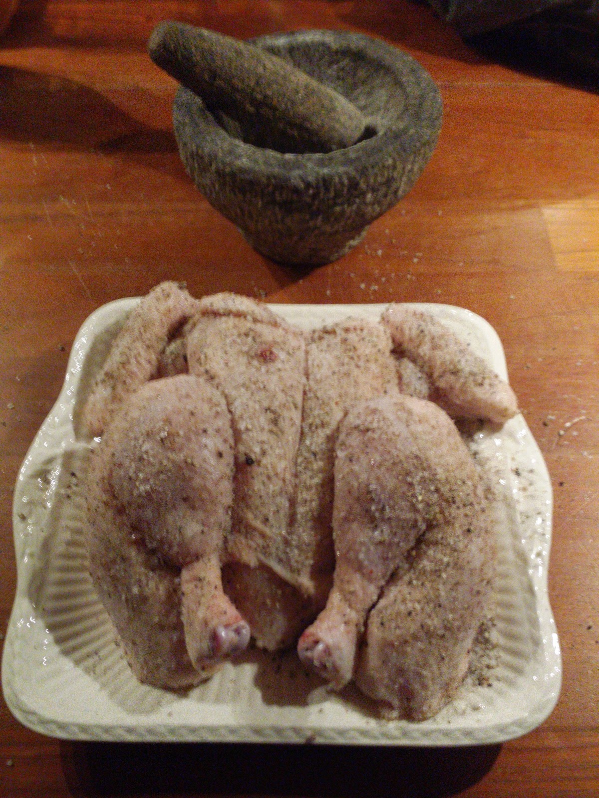 Sprinkle the salt/pepper mixture on it and focus a bit more on the thighs and the breast parts.