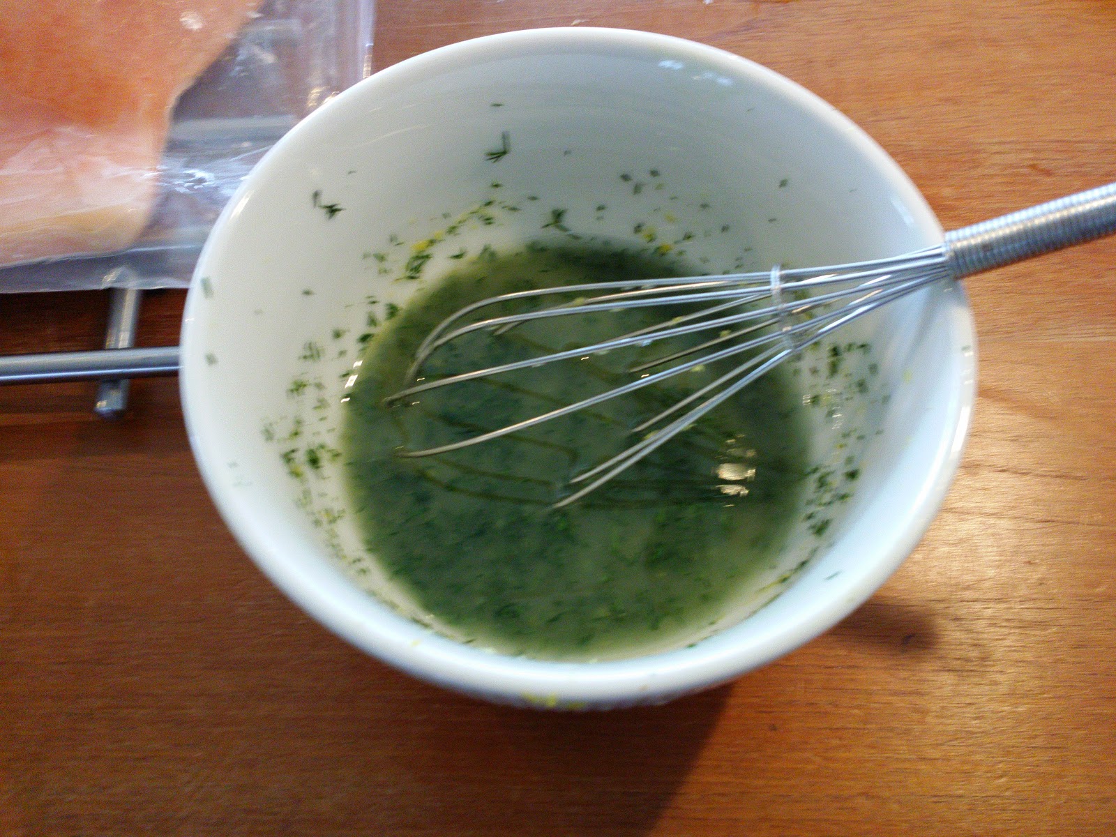I used olive oil, lemon grate, the juice as well, and a nice bunch of dill. Some salt and pepper to the taste and I rubbed in the salmon with it, about 30 minutes before it is ready to go on the grill, and placed it in a ziplock in the fridge.