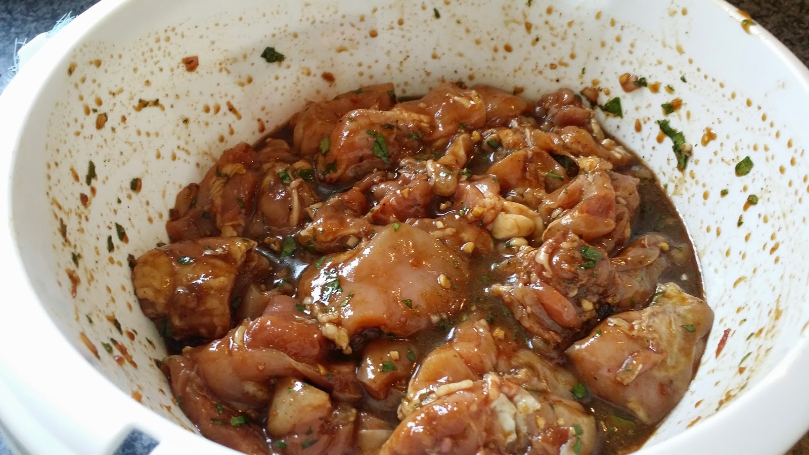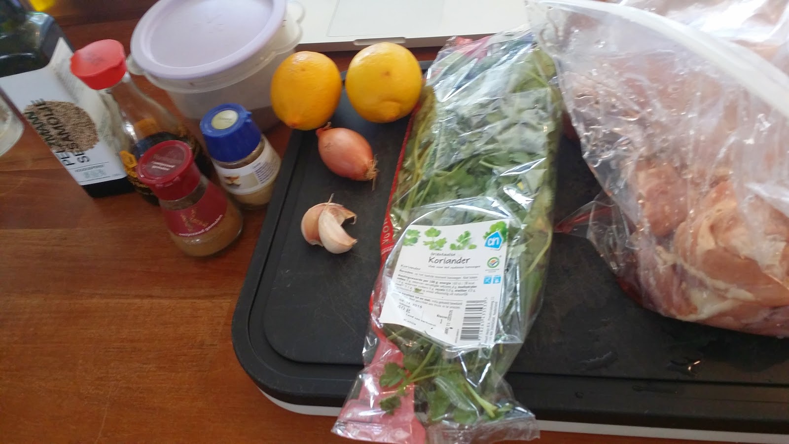 Now I removed the fat from the chicken thighs and sliced it up in nice and evenly parts and placed them in the marinade. Covered it with plastic and placed it in the fridge for about 6 hours. (longer was probably even better, but I didn’t have anymore time. Starving of hunger is not an option in my book, so it had to be done).