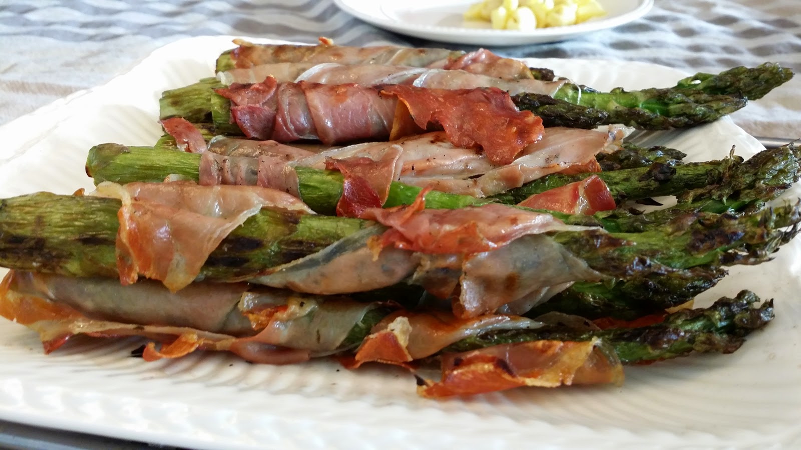The asparagus have been grilled similar to the satay sticks, turning them around frequently in order not to burn them. Once grilled, I wrapped them in parma ham and placed them back on the coals for some more time to crisp up the ham. By now, it smelled fantastic.