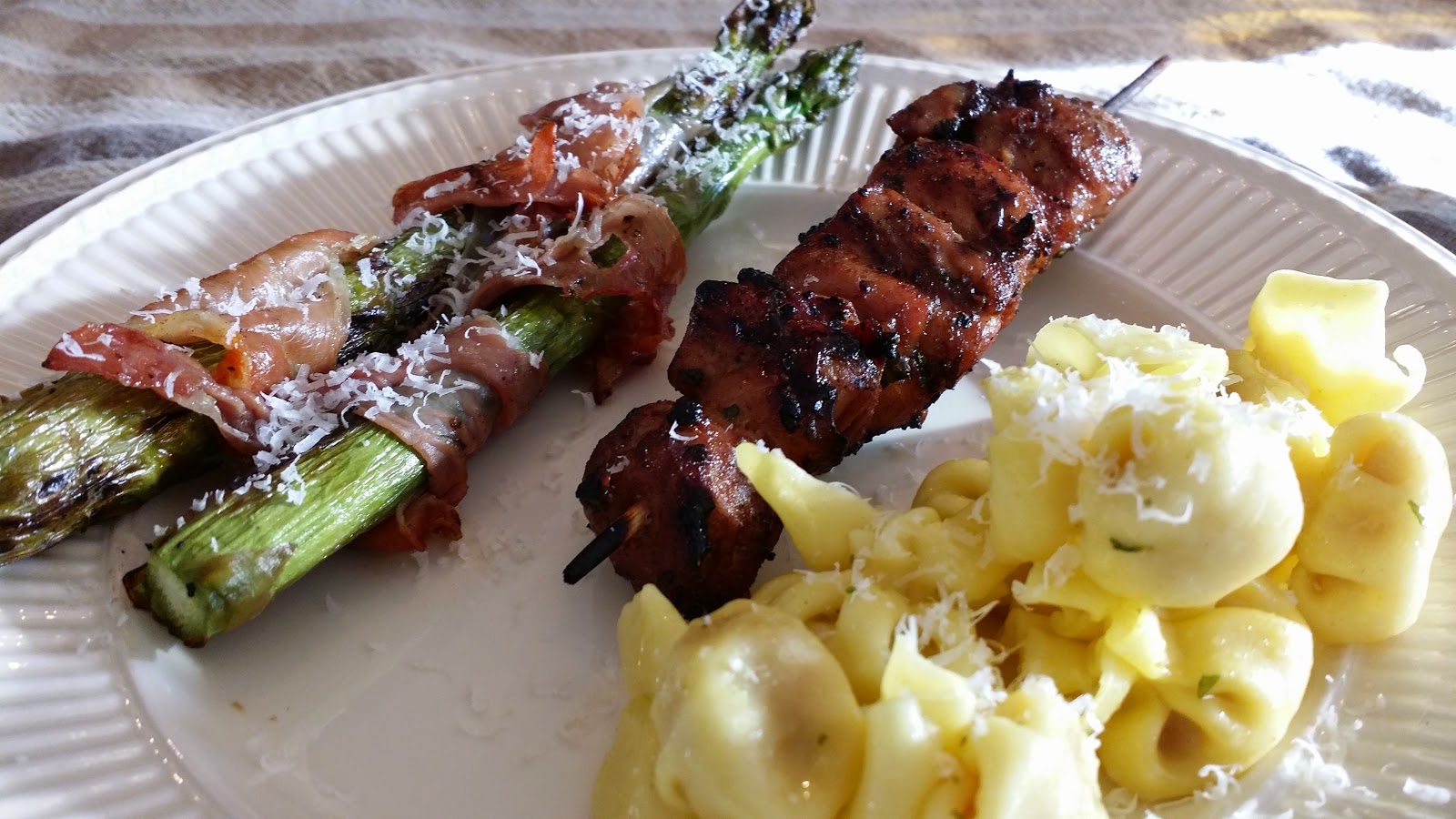 Waiting is always the hardest thing, but I covered my time with some veggies. We decided to eat green asparagus rolled in parma ham with it and some pasta. Pasta is not my thing from the grill, but the veggies on the other hand …..