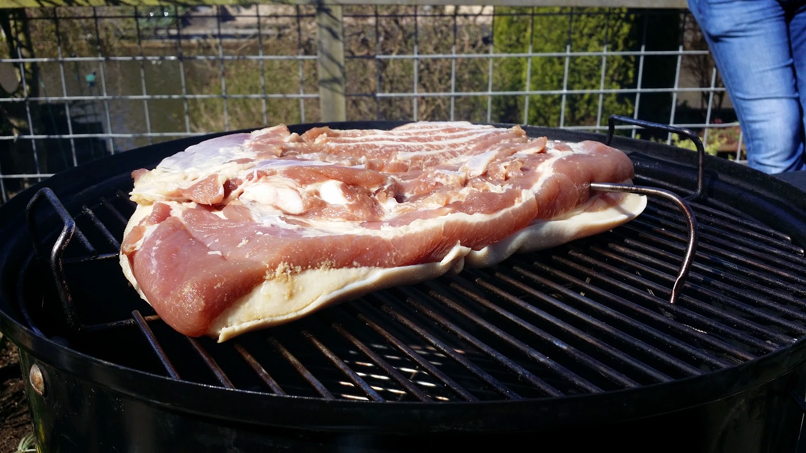 So …. grilling time! Lite up the Q (or the WSM in my case) and wait until the temperature is settled at around 107 degrees celcius (225 F). Now I’ve placed the bacon on the top grill and stuck a food probe in there. I’ve also added some woodchuncks (apple) to the coals. Now, close the lid and don’t look again, until it’s finished, because you all might know, “If you’re looking, you ain’t cooking!”.