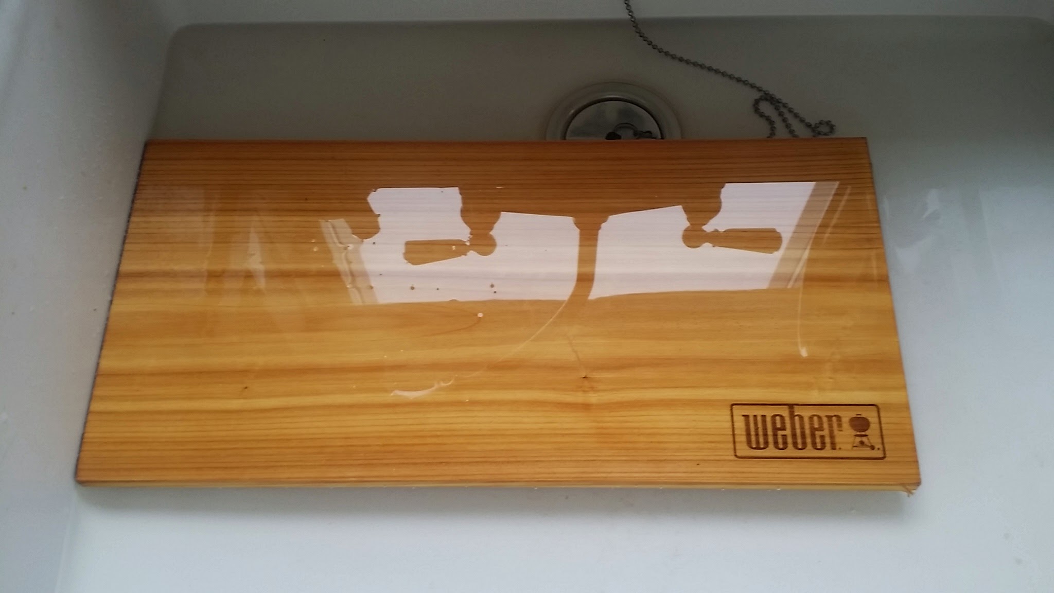 About 2 hours before grilling time, I’ve placed a cedar wood plank in water and let it soak. Meanwhile I rinsed of the sugar and salt coating from the salmon and dried it with some paper towels. This will make sure that the smoke flavour will stick to the salmon better.