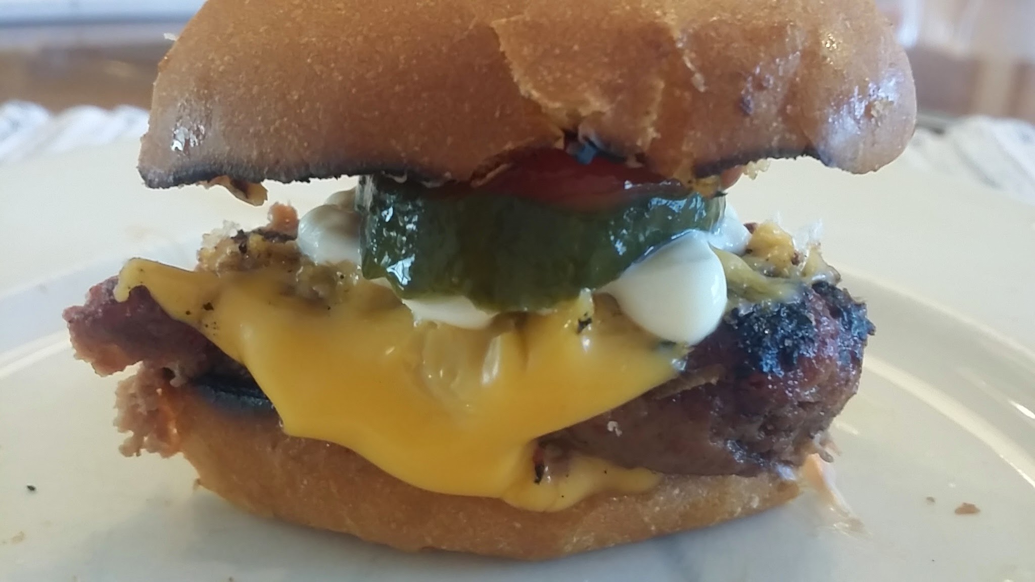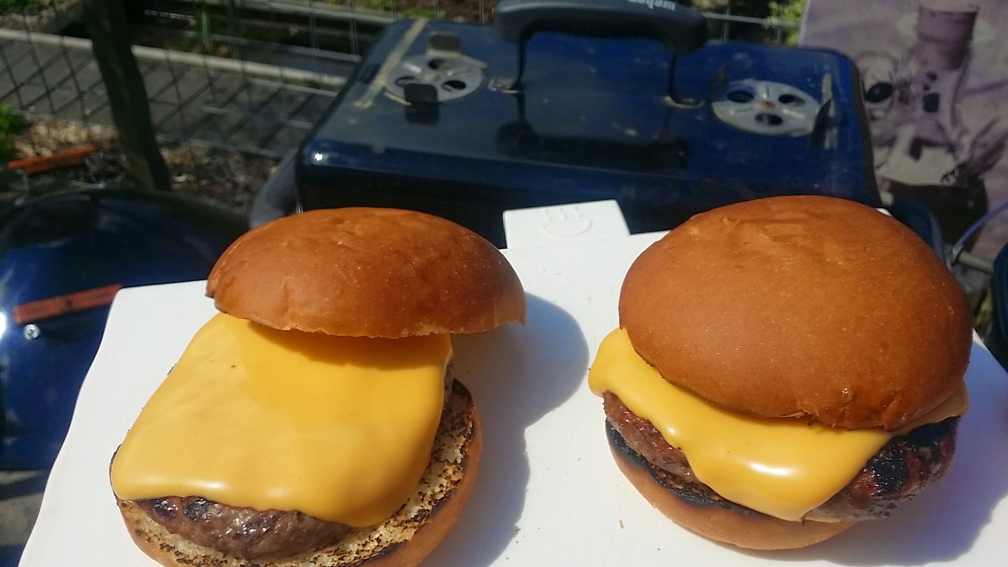 Placed the grill back on top and grilled the 2 burgers directly. Once done, I moved them to the indirect spot, and very briefly grilled the buns. Meanwhile I placed some cheddar cheese on the burgers and voila!
