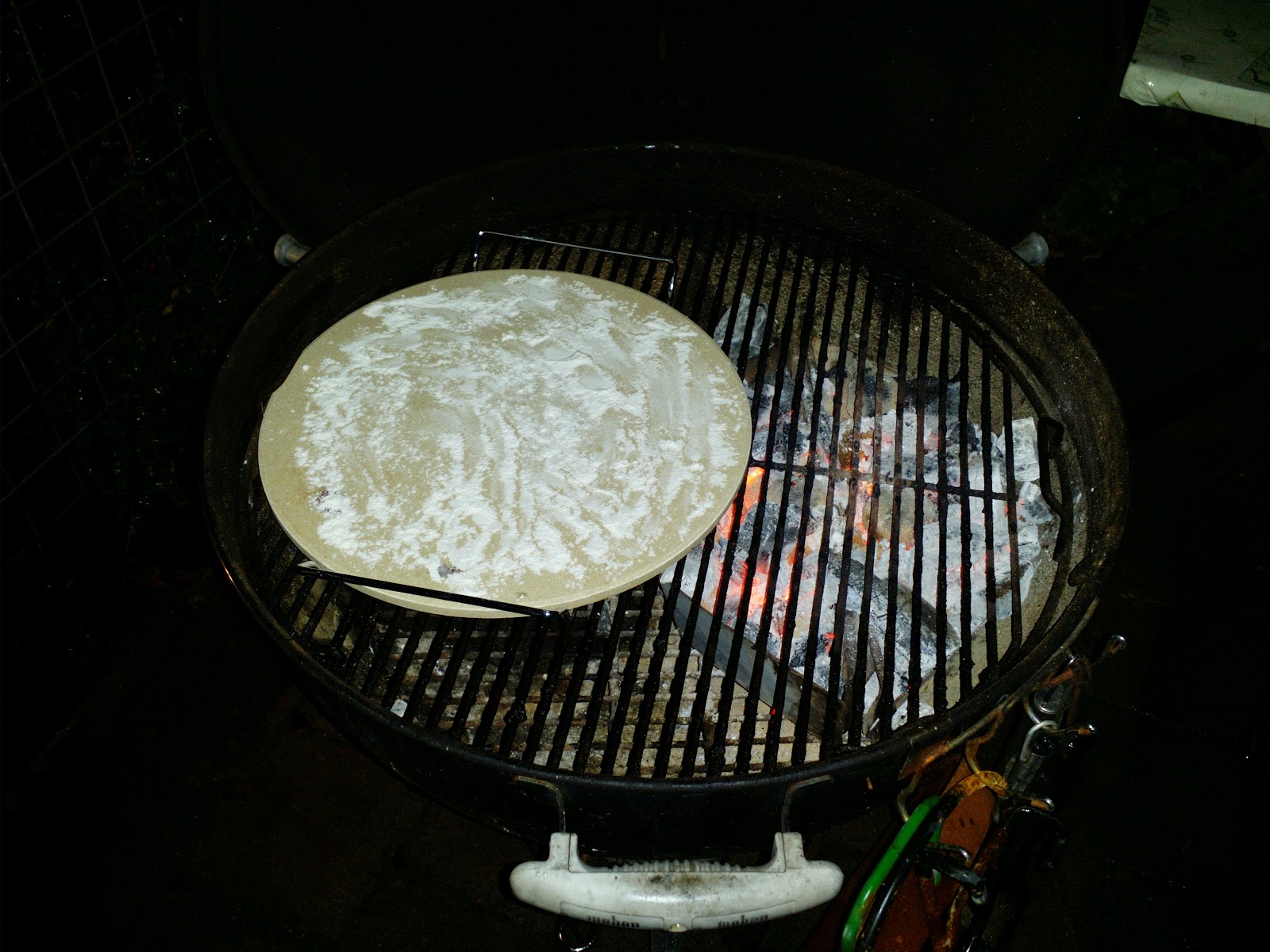 I got my very first pizza stone for the BBQ yesterday and decided to give the rock a spin. First of all, I had to fire up the Q, which was easy, since we already had some friends over and we did some saucages on the grill. Lovely. But that also meant that the grill was already hot.